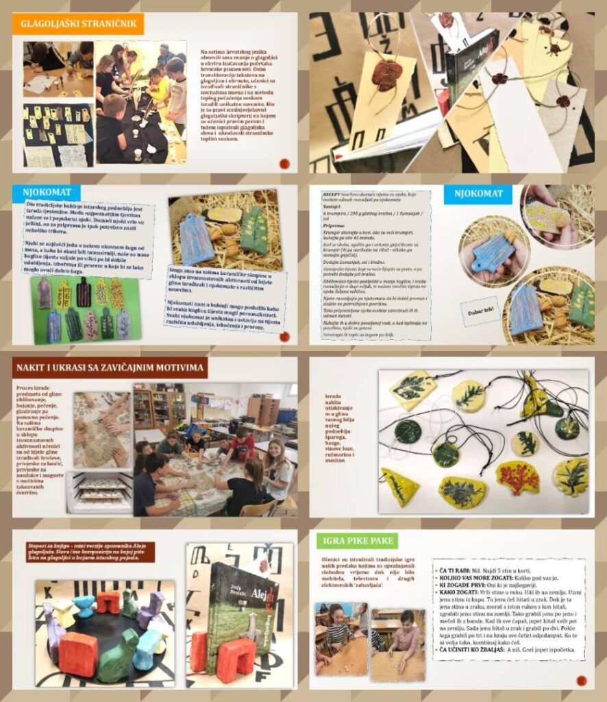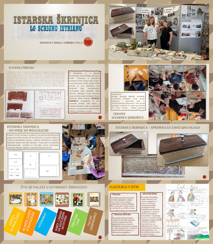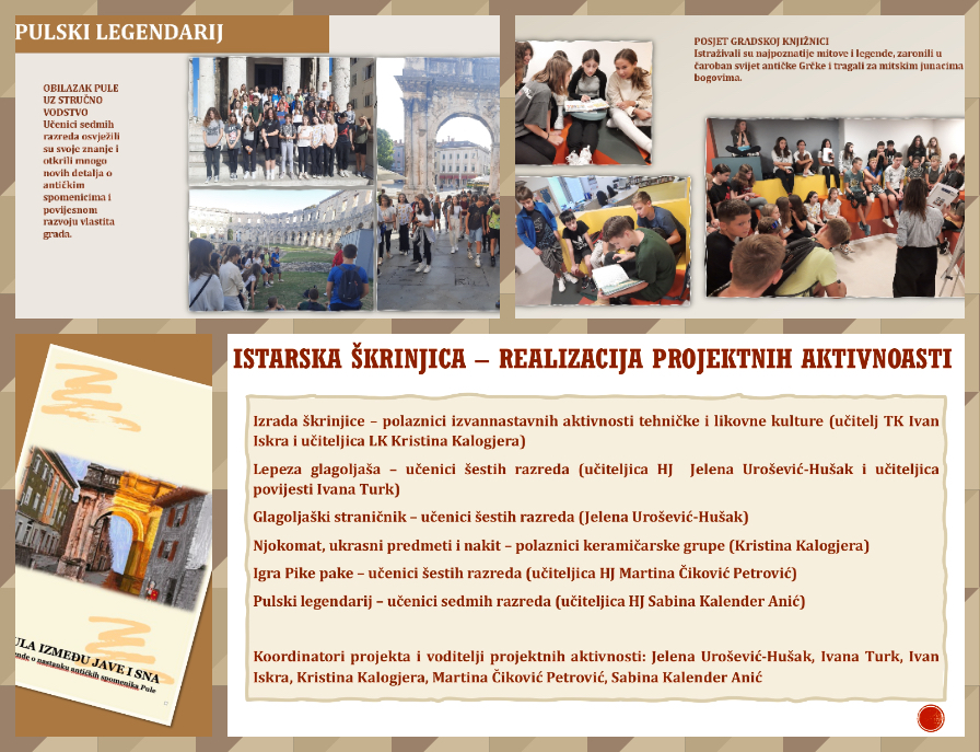Šest različitih aktivnosti u okviru zavičajne nastave provodilo se s velikim brojem učenika predmetne nastave, a rezultati tih aktivnosti svoje mjesto pronašli su upravo u Istarskoj škrinjici. Glagoljaška lepeza – svojevrsni vodič kroz Aleju glagoljaša u obliku lepeze i s autorskim crtežima spomenika koje su izradili naši učenici šestih razreda nakon istraživačkog rada i terenske nastave na Aleji glagoljaša; ukrasni glagoljaški straničnik sa glagoljskim slovima ukrašeni pečatnjakom i toplim voskom; njokomat – originalno keramičko pomagalo za izradu njoka s različitim uzorcima; ukrasni keramički predmeti i nakit sa zavičajnim motivima; igra Pike pake koju su u slobodno vrijeme igrali naši stari, a učenici su je otkrili istražujući starinske društvene igre; Pulski legendarij – knjižica s legendama o nastanku antičkih spomenika u Puli iz pera naših sedmaša.