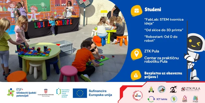 U prostoru ZTK Pula održat će se radionica „FabLab: STEM tvornica ideja”, gdje će polaznici upoznati osnove digitalnog 3D crtanja u aplikaciji Tinkercad, naučiti kako pripremiti svoje modele za ispis te koristiti uređaje za 3D skeniranje i ponovnu upotrebu materijala. Radionica „Od skice do 3D printa” vodi sudionike kroz prve korake 3D modeliranja i printanja, razvijajući pritom njihovu kreativnost i tehničke vještine. Programi su prilagođeni učenicima školske dobi, ali dobrodošli su svi zainteresirani.